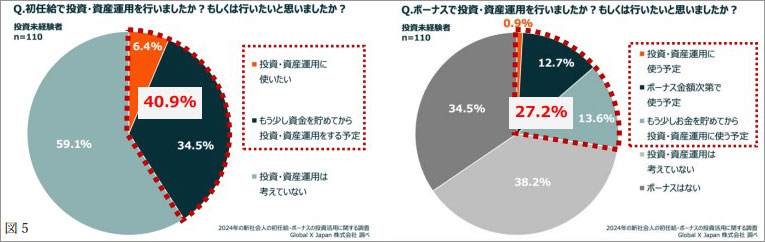 いっぽう、投資経験のない今年の新社会人も投資意欲が全く無いわけではなく、6.4%が初任給を投資に使う予定、またもう少しお金を貯めたら投資をする予定である人が 34.5%と、合わせて 40.9%の人が投資をする意向であることがわかった。