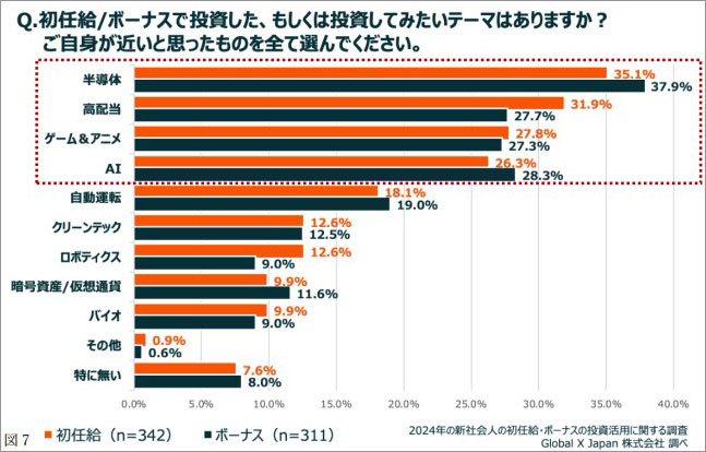 今年の新社会人が投資したいテーマとして最も多く選ばれたのは、初任給・ボーナス共に「半導体」。続いて、「高配当」「ゲーム&アニメ」「AI」といったテーマが 20%を超える結果に。