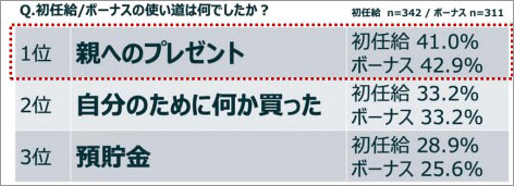 初任給とボーナスの使い道は、どちらも TOP3 は同じく1位『親へのプレゼント」、2位「自分のために何か買った」、3位「預貯金」に。今年の新社会人も、初任給やボーナスは自分のために使うことはもちろん、育ててくれた親への感謝の気持ちを忘れていない。