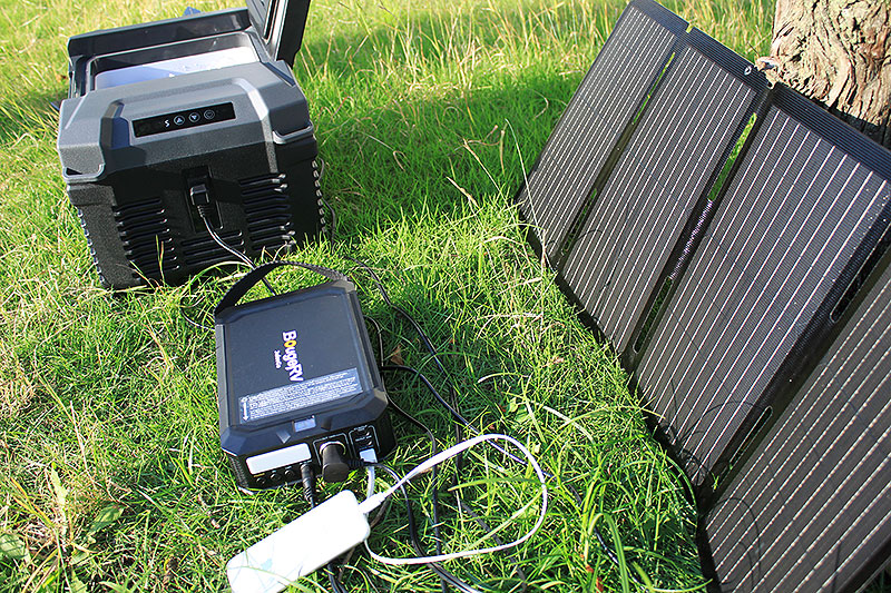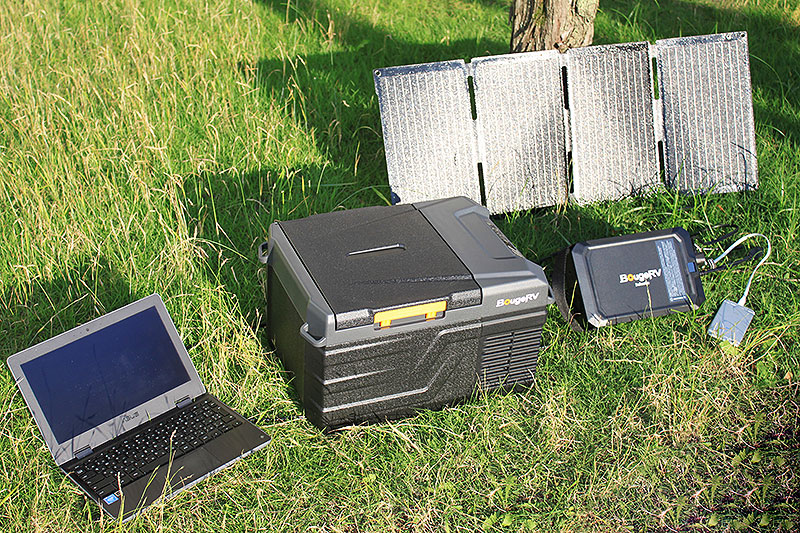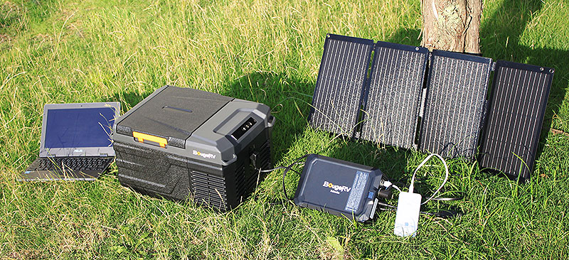 さらに、ポータブル電源「BougeRV JuiceGo」に「BougeRV 50W ソーラーパネル」をつなげば、太陽光で充電しながらスマホ・ノートPC・扇風機・冷蔵庫などを動かせる。これもありがたい。