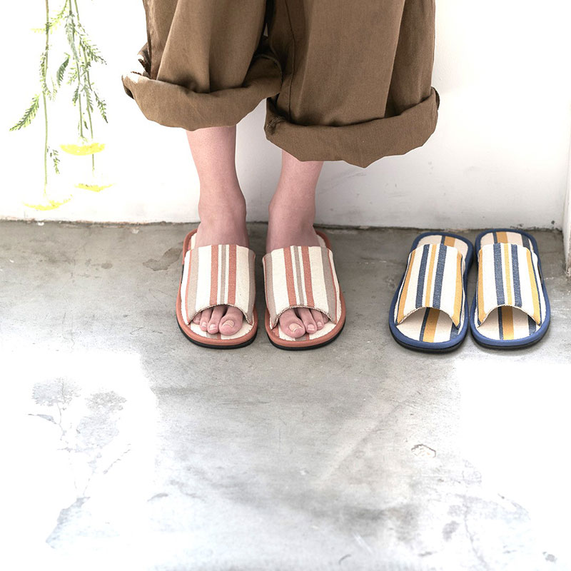 播州織や泉大津の綿ブランケットなど、国産の天然素材にこだわったアイテムを制作。ハンドメイドインジャパンフェス先行販売の高島帆布のスリッパは丈夫で足になじみ、夏におすすめ。