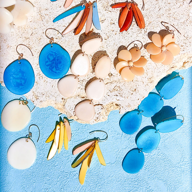 自然落下した“象牙ヤシ”の実をスライスしたアクセサリーが人気。とても軽くて丈夫で、環境に配慮した染料で染められている。ハンドメイドインジャパンフェス限定アイテムも登場するほか、オーダーメイドにも対応。