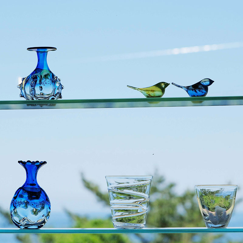 福井県の越前海岸でつくられたグラスや風鈴などのガラス作品。吹きガラスの柔らかく自由な形や鮮やかな色が魅力。