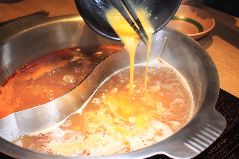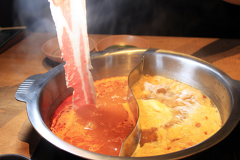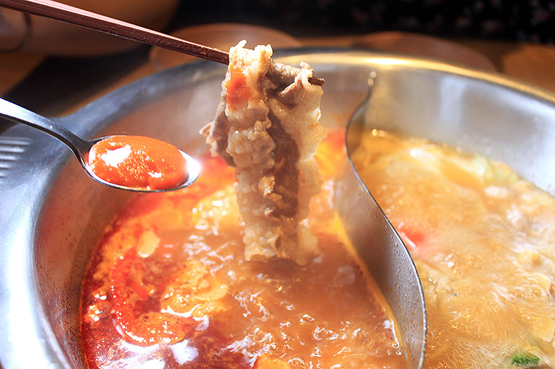 黄色いニンニク鍋の次は、赤だ、赤い火星へだ! コク深い味わいとレッド輝く「魚介香る旨辛火鍋」へ、新鮮な牛肉を、スーッとくぐらせる。