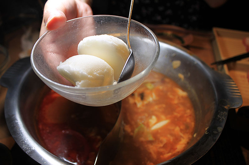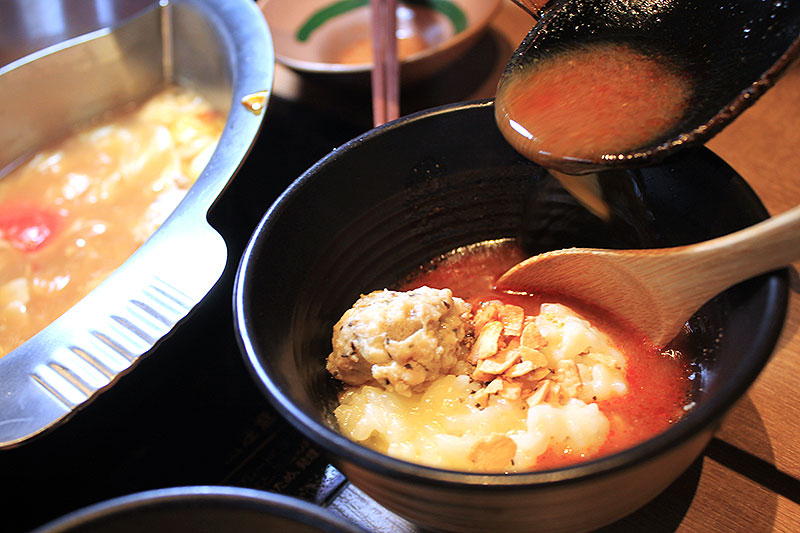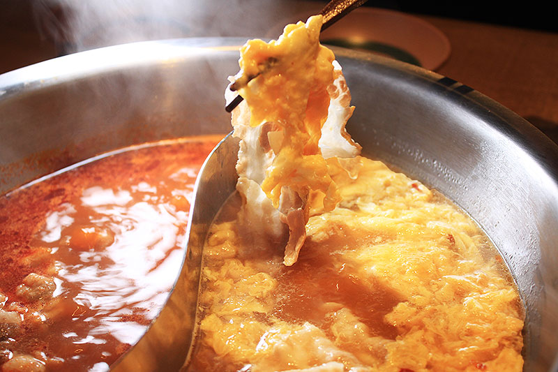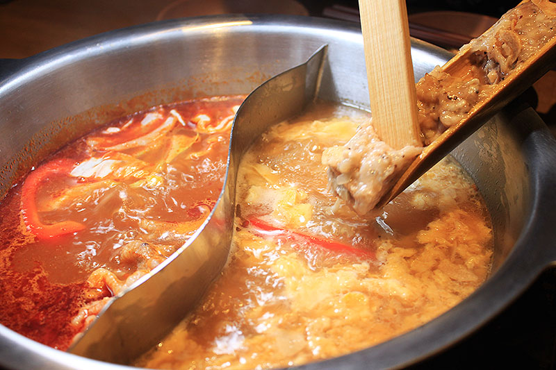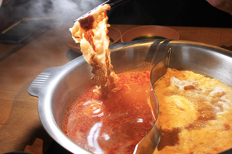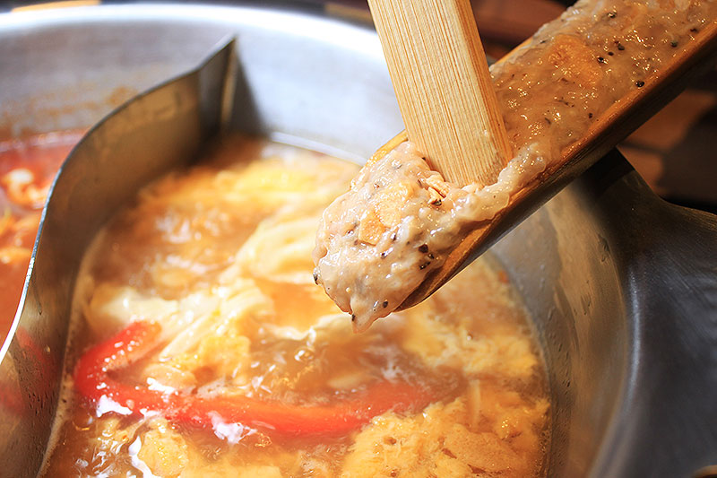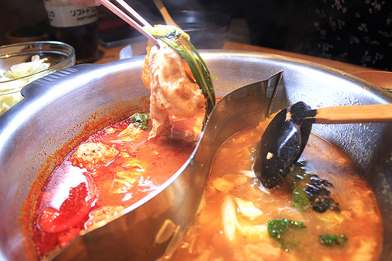 黄色いにんにく鍋スープと違い、こちらは真っ赤な旨味たっぷりスープ。