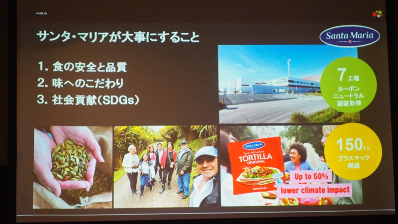 企業姿勢として大事にしていることは、食の安全と品質・味に対するこだわり・社会貢献の3つ。子供でも安全に食べられて、美味しく栄養も摂れるのがサンタ・マリアのテックス・メックス商品ということになる。