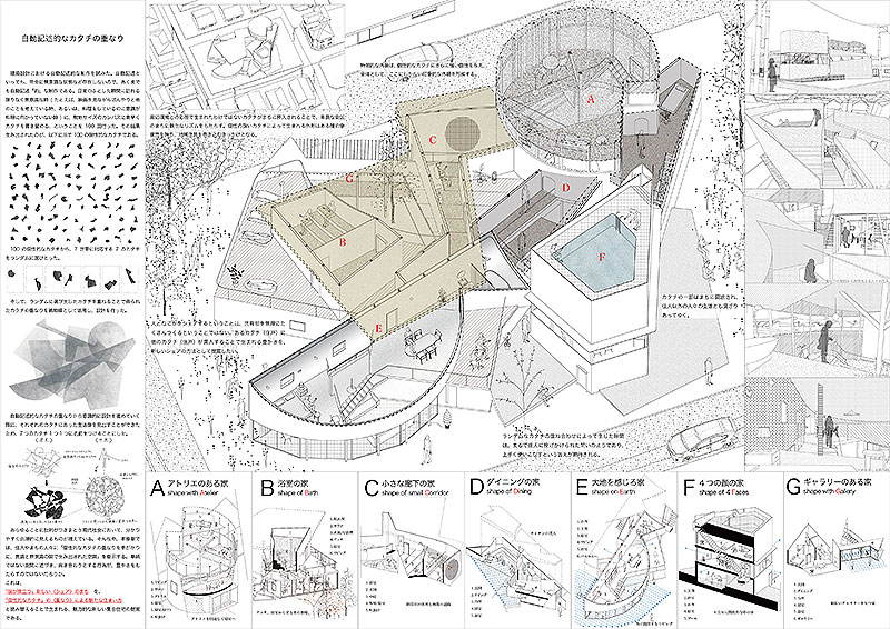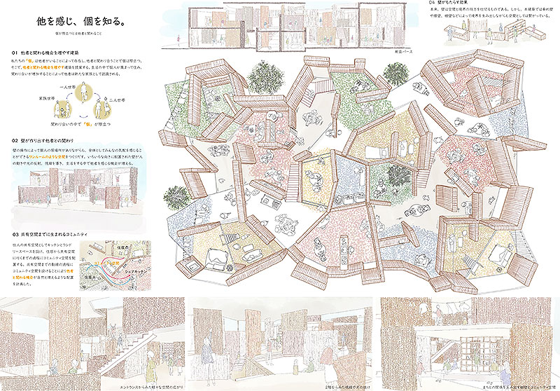 「あらゆることに批判がつきまとう現代社会において、わかりやすく合理的にみえるものが増えている。そんななか、この提案では、住人やまちの人々に『個性的なカタチの重なりを手がかりに、意識と無意識の間で生み出された空間』を提示する。単純ではない空間に近づき、向き合おうとする行為が、豊かさをもたらすのではないだろうか。これは、『個が際立つ』新しい<シェア>のまちを、『個性的なカタチ』の<重なり>による新たな住まい方と読み替えることで生まれる、魅力的な新しい集合住宅の提案である」