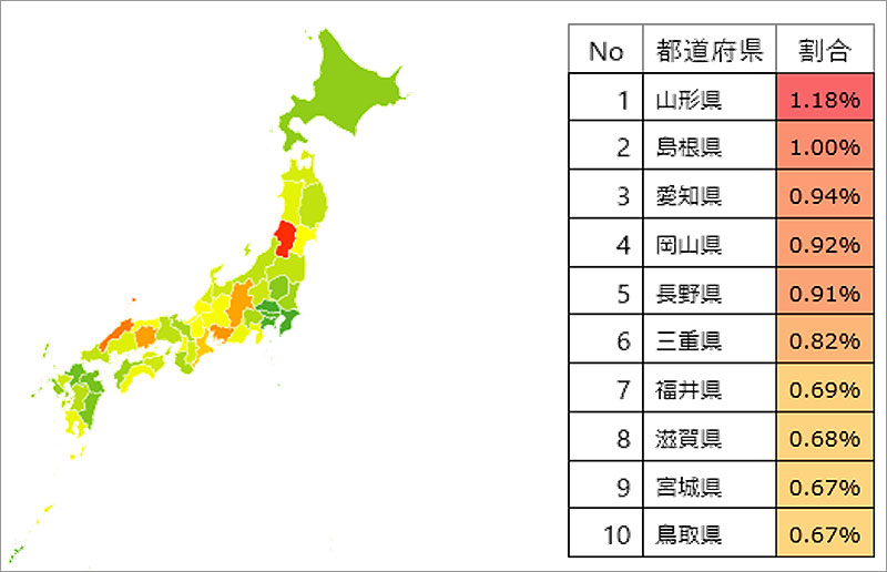 企業の間で注目が高まっており、どの地方で認定に熱心かをみるため都道府県マップを作成したところ、山形、島根、愛知、岡山、長野が上位にランクイン。経産省サイト資料でも同じ傾向が確かめられた。