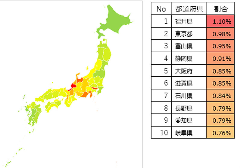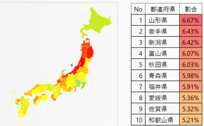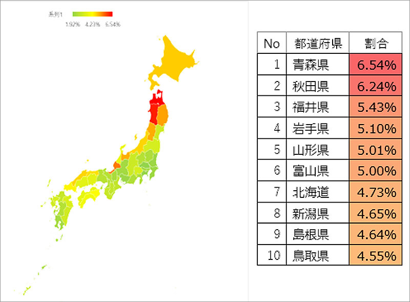東北・日本海側で割合が高い傾向が見てとれた。
