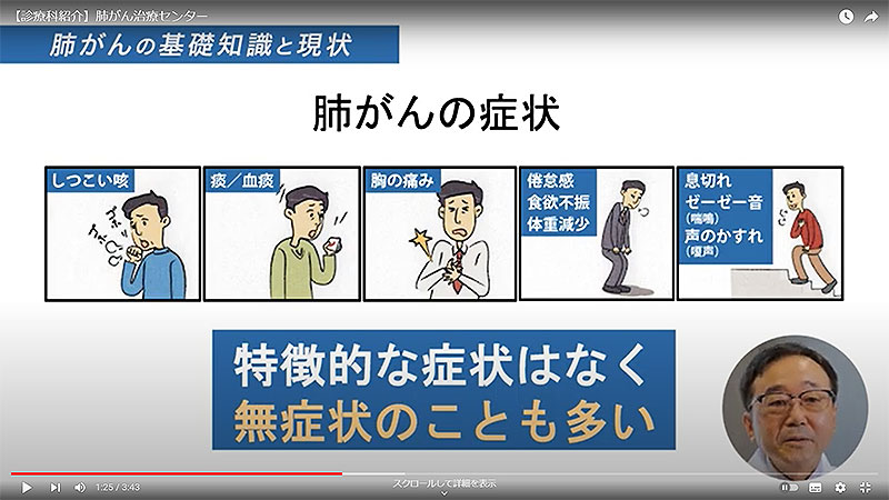 「肺がんがあっても自覚症状が無いことが多く、検診は重要。腺がんはタバコとの関連性は低く、非喫煙者や若い人でも罹患する」