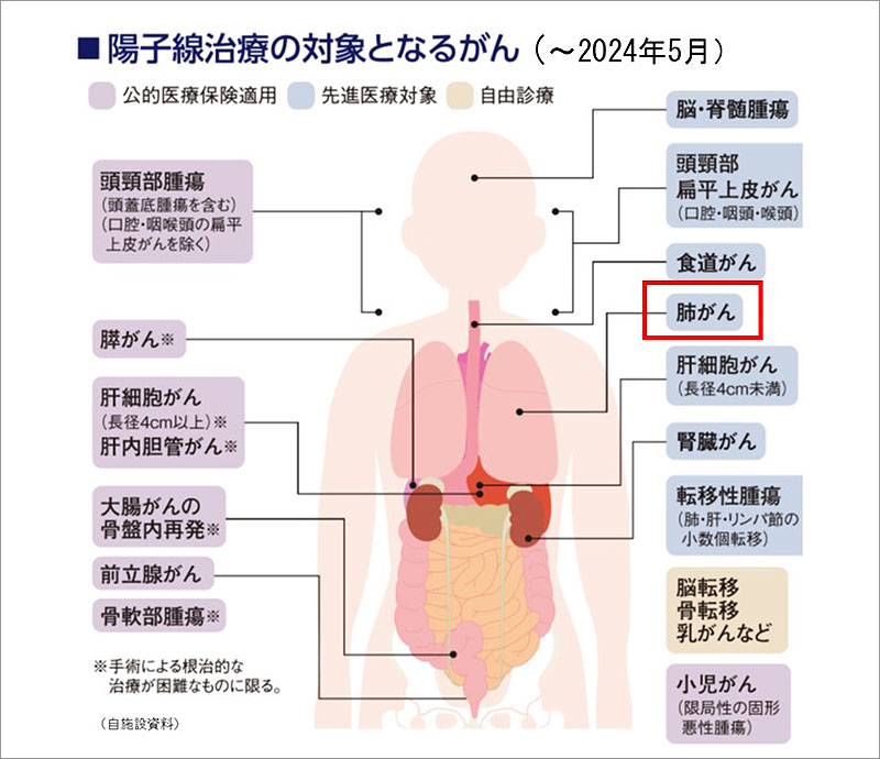 また放射線療法については、2024年6月から早期肺がんI~IIA期(切除不能なものに限る)について、陽子線治療が公的医療保険が適用できるようになった。