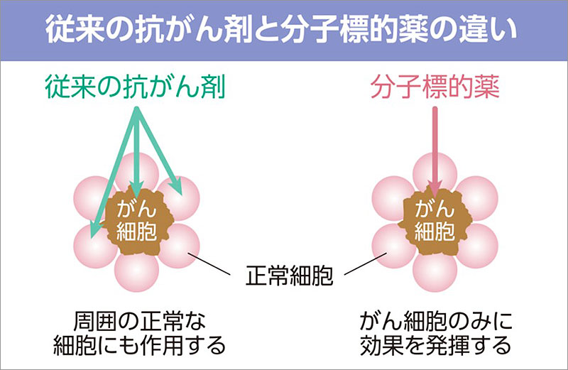 「分子標的薬は、がんの増殖に関わるタンパク質などの特定の分子にだけ作用するようにつくられ、異常な遺伝子タイプごとに対応する薬がある。