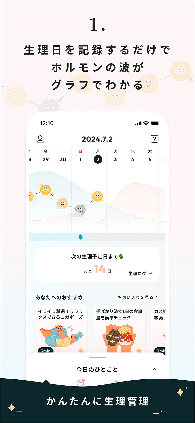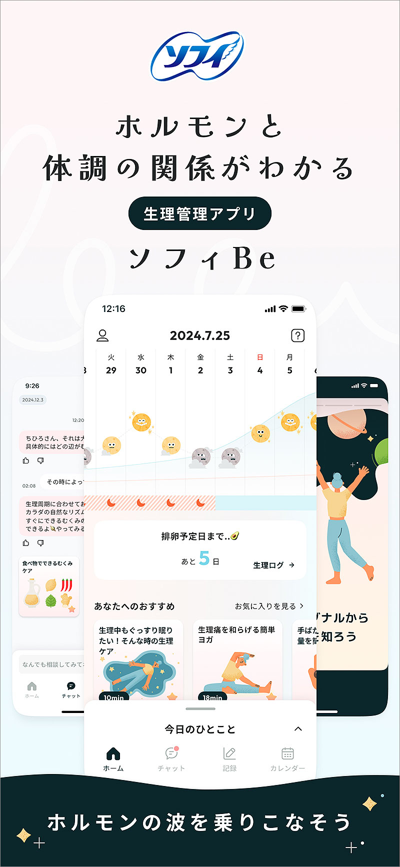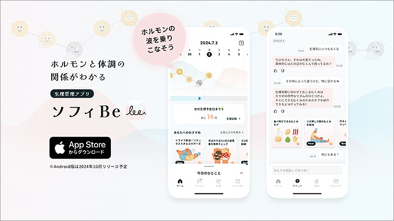 そんな女性のつらい悩みを、「女性の自己効力感(自分の能力を信じる気持ち)を高める」をめざすユニ・チャームが、ホルモンバランスを活用した生理管理アプリ『ソフィBe』iOS版(無料)をきょう7月23日から配信開始(Android版はことし10月から)。