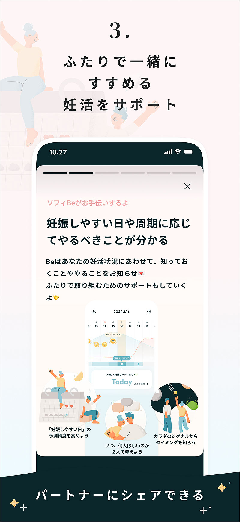 この「妊活プランシミュレーション」で、パートナーと二人で協力しあって妊活をすすめることができ、『ソフィBe』は頼れる存在に。
