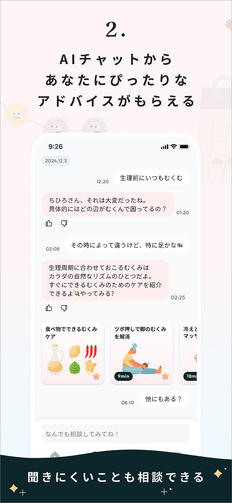 ユニ・チャーム生理管理アプリ『ソフィBe』は、生成AIが心とカラダの疑問に答えてくれるのも特長。