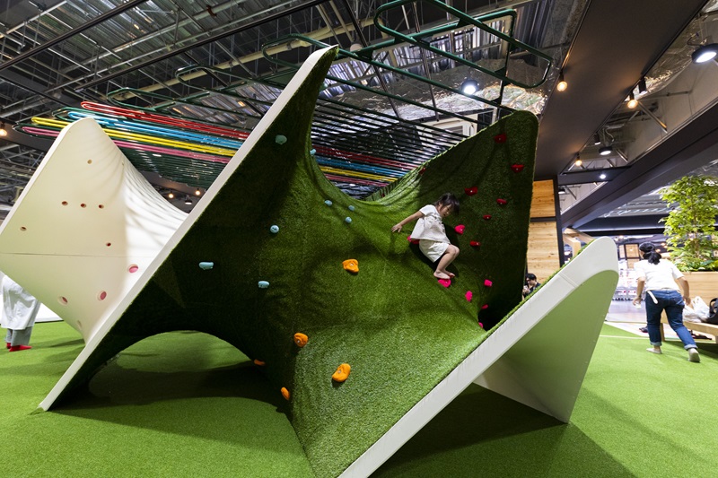 クレーンゲームなどの筐体だけでなく、飛んだり、跳ねたり、登ったりして遊べる「ふわふわドーム」、慶應義塾大学湘南藤沢キャンパス鳴川研究室や遊具メーカーのジャクエツと共同開発した「ねじれクライム」など、子供心をくすぐる遊具が用意されている。