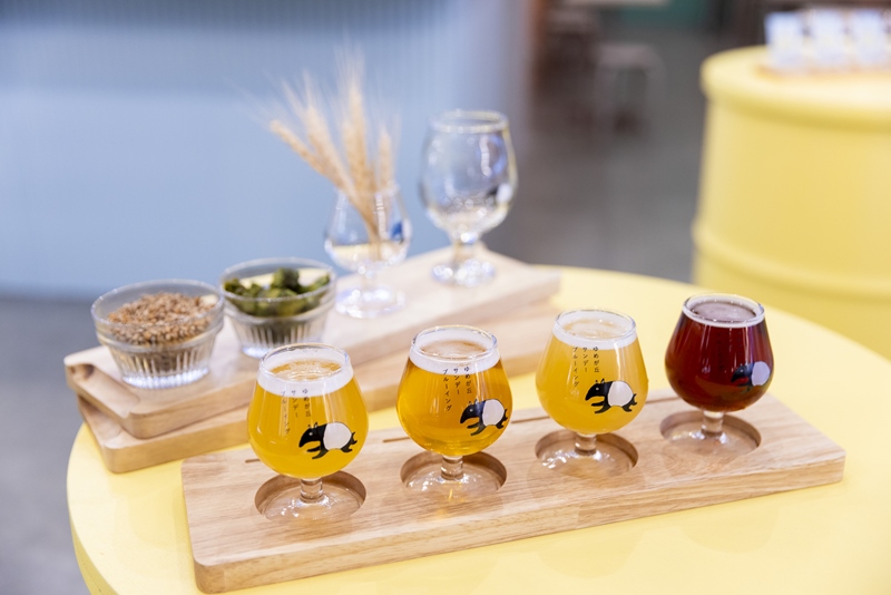 生産者にスポットを当てたお店として見逃せないのが「YUMEGAOKA SUNDAY BREWING」。ゆめが丘産のホップを使用し、地域のみんなでつくるクラフトビールの醸造所。店内で醸造した出来立てのビールは併設の飲食店で、最大10類同時に楽しめる。