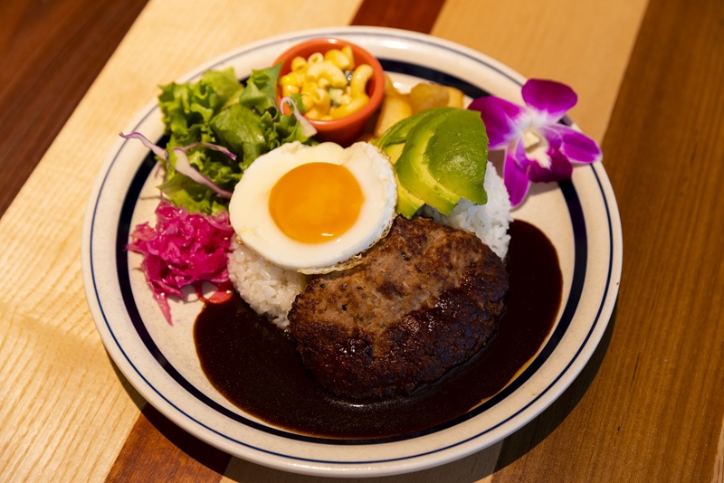 ソラトスへの出店へ向けて一年ほど前から準備を続けており、牛100%のハンバーグとデミグラス風のソースなどで充実したメニューを揃え、ハワイアンなひと時を演出する。