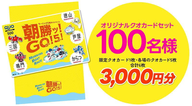 ひとつは、ハズレた人のなかから抽選で100人に「GO! 5! MORNING BOAT RACE」オリジナルクオカードが当たる!