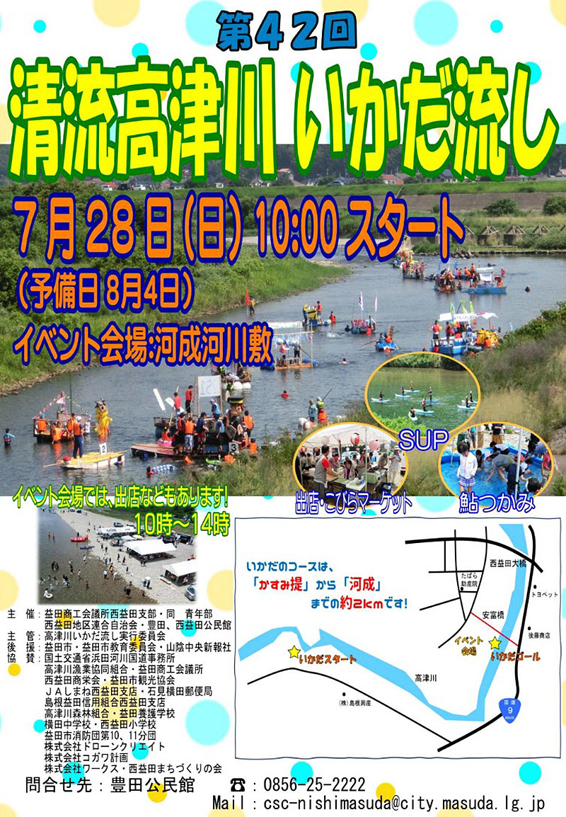 7月28日、河成河川敷(安富橋付近 益田市安富町)で、「清流高津川いかだ流し」で 10:00 からスタート!(予備日8月4日)