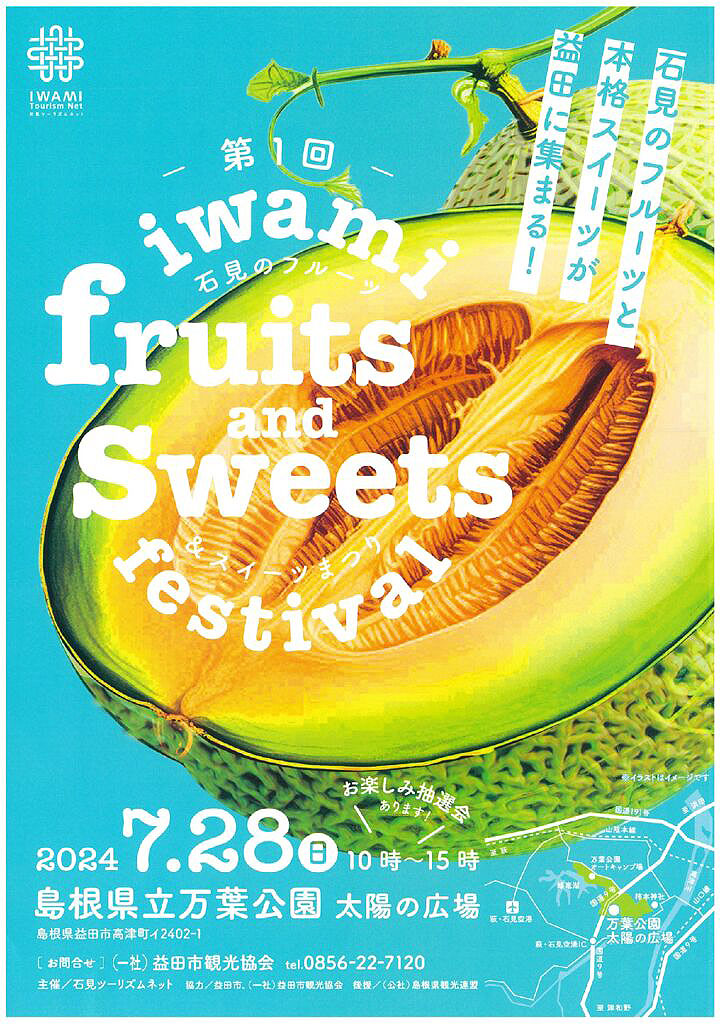 島根県立万葉公園 太陽の広場(島根県益田市髙津イ2402-1)では、10:00~15:00 に、第1回 石見のフルーツ&スイーツまつり を開催!