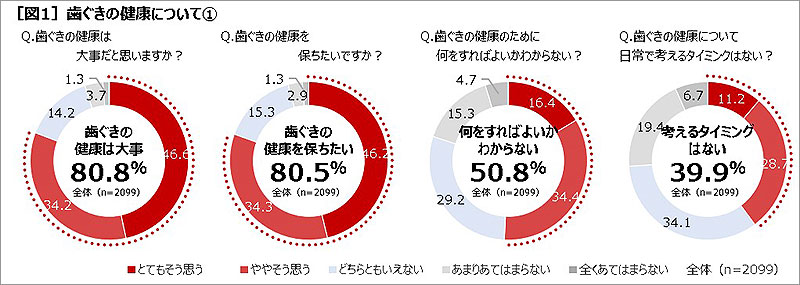 ロッテが20~70代以上の男女2,099人を対象に実施した「歯づまり」に関する調査では、80.8%が「歯ぐきの健康は大切だ」と感じ、80.5%が「歯ぐきの健康を保ちたい」という思いを持っていることがわかった。