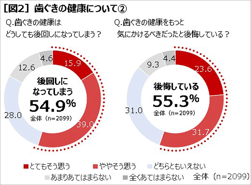 54.9%の人が歯ぐきケアを後回しにし、55.3%の人は「歯ぐきの健康をもっと気にかけるべきだったと後悔している」ことがわかった。