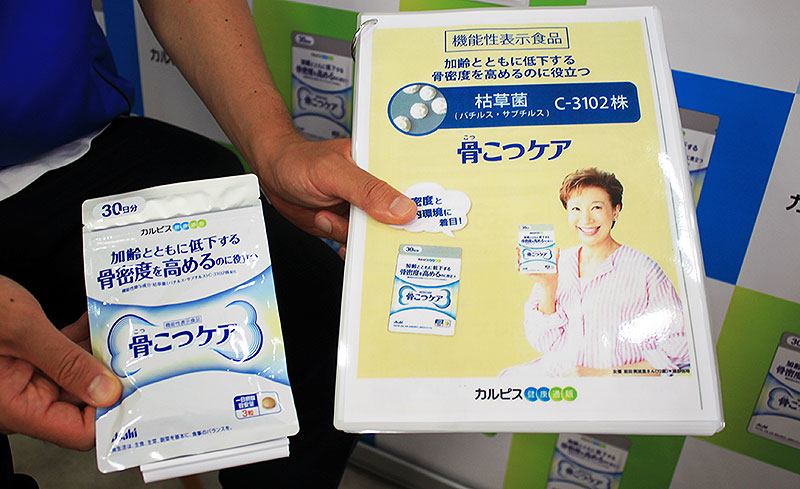 この機能性表示食品「骨こつケア」は、アサヒグループ独自の菌「枯草菌」(バチルス・サブチルス) C-3102株を配合し、骨の健康が気になる健常な人に適した機能性表示食品ということで注目を集めている。