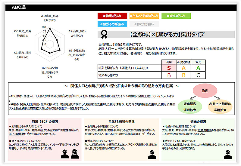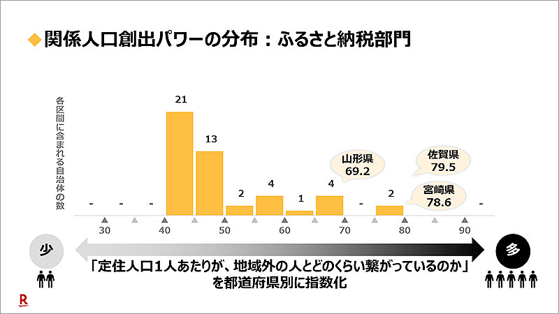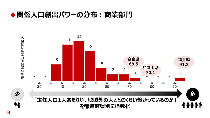 楽天は、自社マーケティングデータにもとづき、商業(楽天市場 EC)・観光(楽天トラベル)・ふるさと納税(楽天ふるさと納税)の3領域で、47都道府県別「定住人口1人あたりが、地域外の人とどれくらいつながりがあるか」を相対的な関係指数として算出。