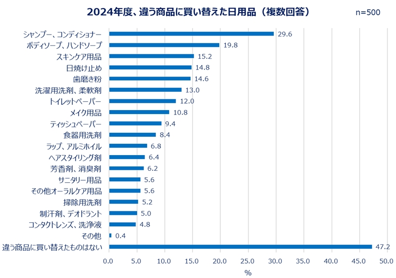 具体的に買い替えた商品1位は「シャンプー、コンディショナー」(29.6%)、2位は「ボディソープ、ハンドソープ」(19.8%)。
