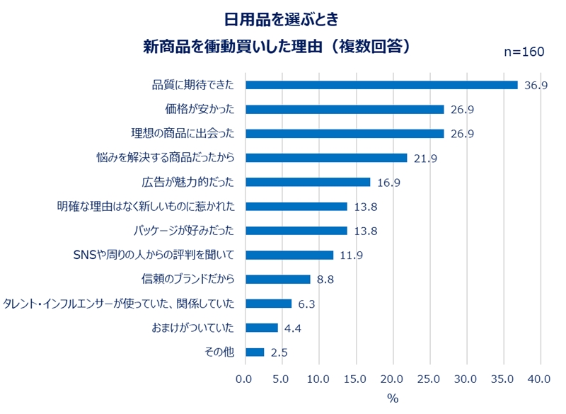 「日用品を選ぶとき新商品を衝動買いした経験がある」という人は、約3割。理由を聞いたところ、3割以上が「品質に期待できたから」(36.9%)と回答した。