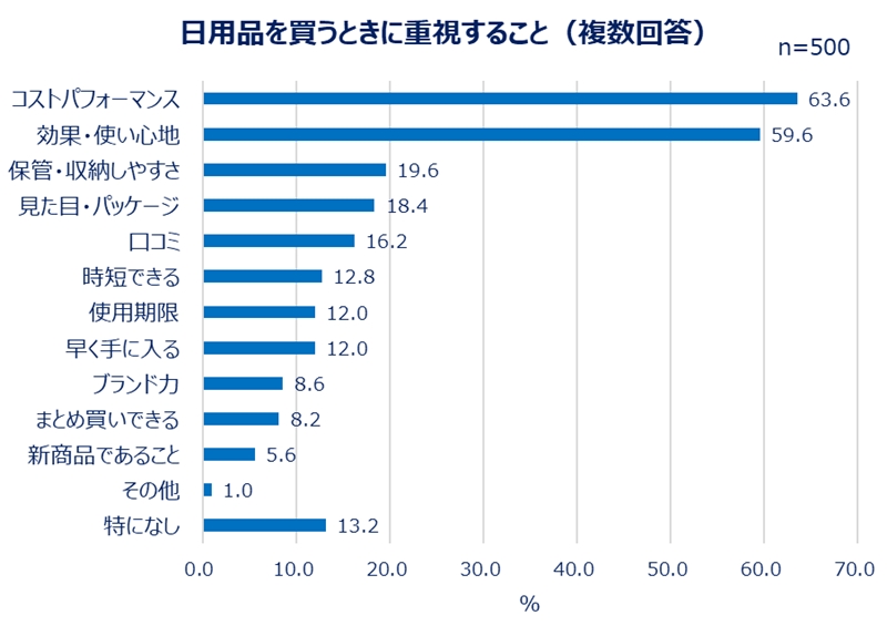 毎日消耗していく日用品。買うときに何を重視しているか聞いたところ、約6割が「コストパフォーマンス」(63.6%)、「効果・使い心地」(59.6%)と回答した。