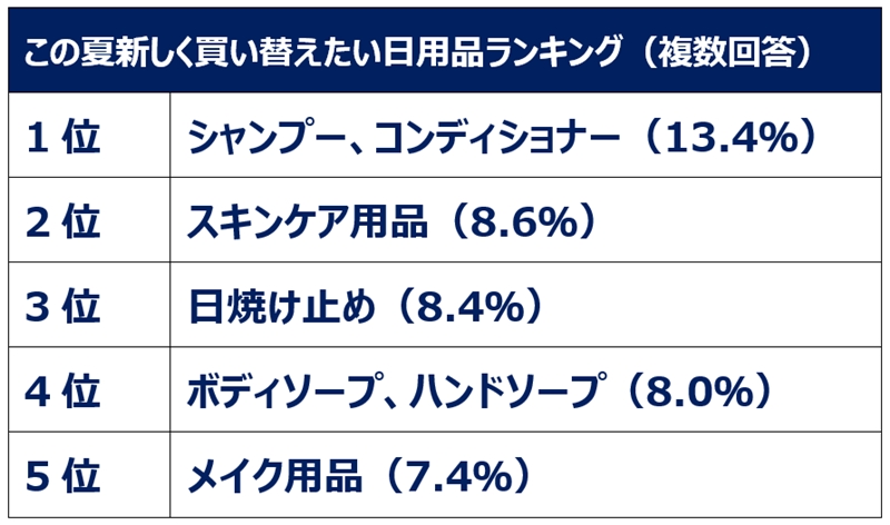 この夏新しく買い替えたい日用品の1位は「シャンプー、コンディショナー」(13.4%)だった。理由としては、気分を変えたい、夏ならではの商品に変えたいという声があった。