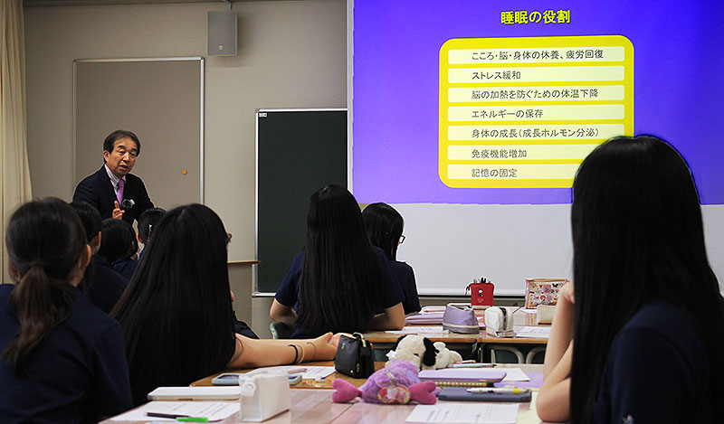 学生たちは、内村直尚先生から「こころ・脳・身体の休養、疲労回復」「ストレス緩和」「エネルギー保存」「身体の成長(成長ホルモン分泌)」「免疫機能増加」「記憶の固定」といった睡眠の役割や、「朝の光は体内時計を早め、夜の光は体内時計を遅らせる」「夜中にスマホを使うと、まだ昼だと脳が勘違いし、夜になっても眠気がなく、結果、朝起きられなくなる」といった光と身体の関係などを学んだ。