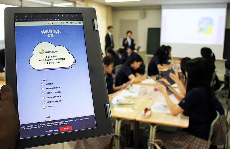 学生たちは、ジンズ ヘルスケア事業部 堀清貴 シニアディレクターや、日本睡眠協会 内村直尚 理事長(久留米大学 学長)の講座を聞き、睡眠の大事さ、入眠への準備などを学んだ。