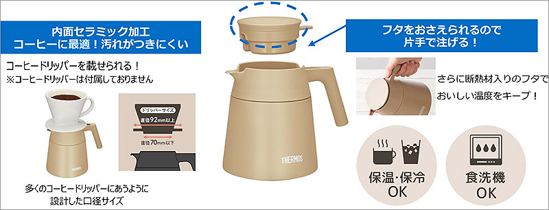 また、真空断熱コーヒーサーバー(TTF-720)は、コーヒードリッパーを載せやすい口径に設計。