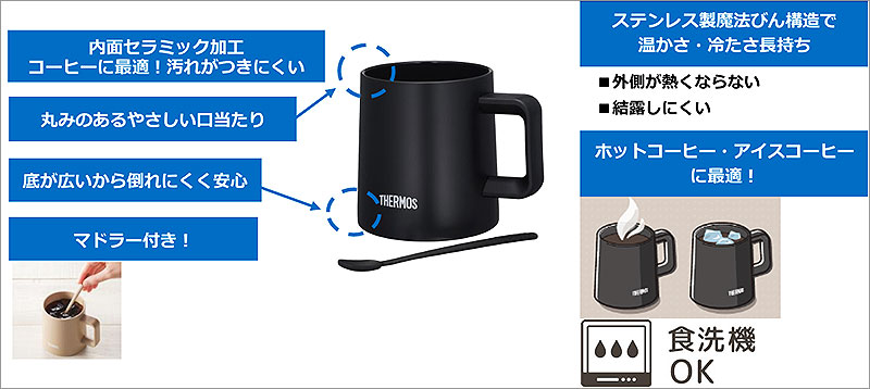 真空断熱マグカップ(JDZ-350)は、魔法びん構造による高い保温・保冷機能によって、ホットコーヒー、アイスコーヒーどちらもおいしい温度で楽しめるアイテムに。