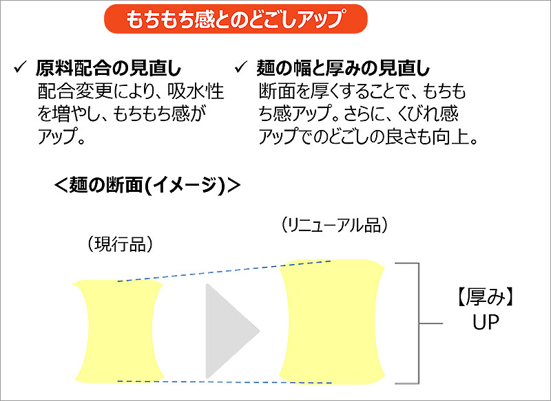 うどん麺は吸水性を増やしモチモチ感アップ。麺の断面を厚くすることで、さらにモチモチ感アップし、くびれ感も増やしたことから“のどごし”もアップ!