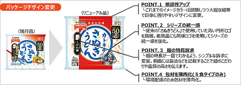 パッケージは40代以上の人はみんな知ってる“さぬきうどんの名門”「カトキチ」の文字を大きくし、ビビットな赤を。