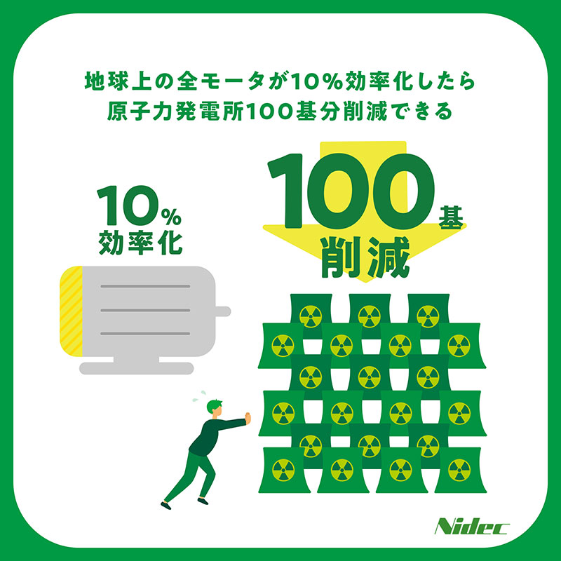 仮に、地球上のすべてのモータの効率を10%改善できれば、原子力発電所100基分の消費電力を削減できる計算に。