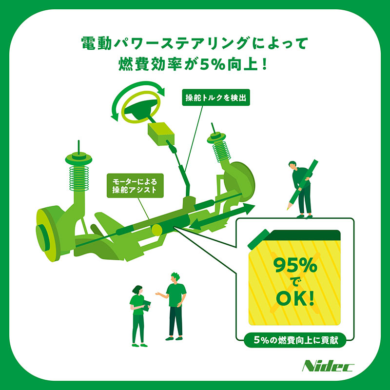 クルマの操舵に必要な力をモータで支援する電動パワーステアリングの導入により、エンジン駆動でエネルギー消費が大きい油圧ポンプ式のステアリングと比べて燃費が5%向上。