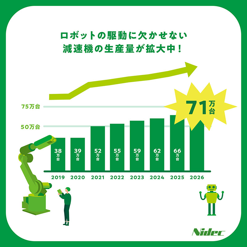 2022年、55万台だった産業用ロボットの世界市場は、人手不足問題や自動化で競争力を高めたい企業の増加により、2026年に71万台に拡大する見通し。