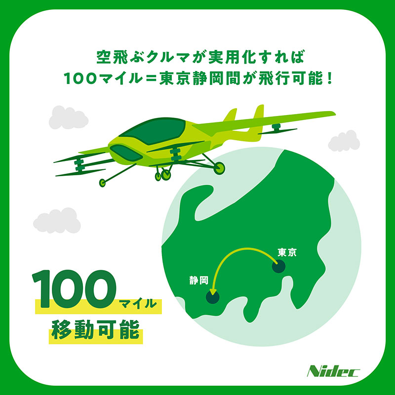 ニデックは、世界第3位の航空機メーカー・エンブラエルと合弁会社を設立し、機体が空中で移動するためのモータ駆動に関する技術を提供し、今後、東京~静岡間と同等の最長100マイル飛行可能な eVTOL が完成する予定だ。