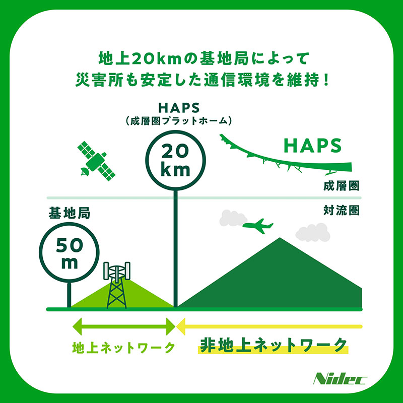 ニデックは、ソーラー発電のみで長時間飛行を行う HAPS 向けに、軽量・高効率・高信頼性のモータを開発し、成層圏の低圧環境でも安定した性能を発揮する高い放熱性を実現させた。