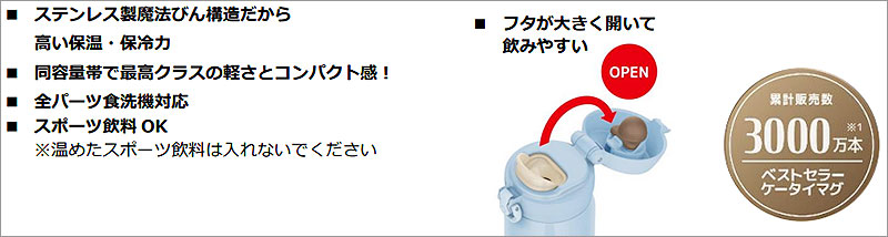 2012年に発売し、サーモス史上最も売れている水筒「真空断熱ケータイマグ(JNLシリーズ)」は、性別や年齢を問わず「使いやすい」ということで、累計販売数3000万本をマーク。