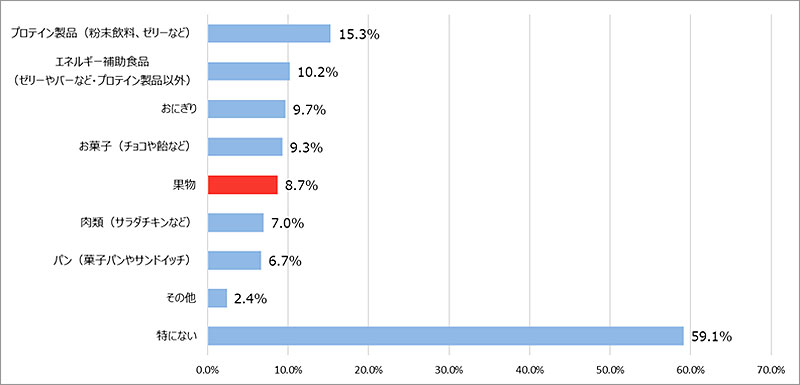 またその人たちに運動をしているときに補給する食品を聞くと、「とくにない」と回答した人が6割ちかくあったいっぽうで、「果物」と回答した人は8.7%に留まる結果に。