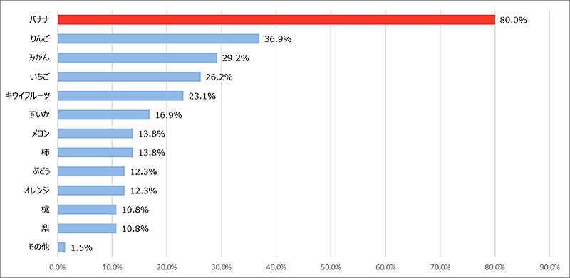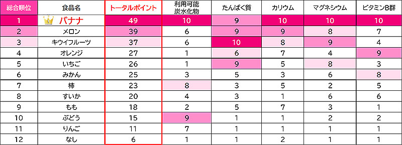 その結果、12品目のフルーツのうち、バナナがトータル49ポイント。2位以下に10ポイントの差をつけてのトップに。