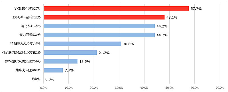 その理由として「すぐに食べられるから(57.7%)」「エネルギー補給のため(48.1%)」が上位で、その手軽さと栄養パフォーマンスの高さから摂取していた。