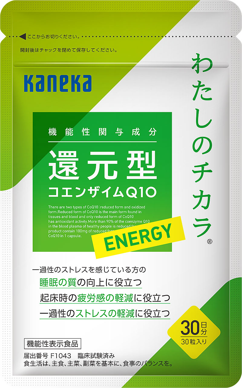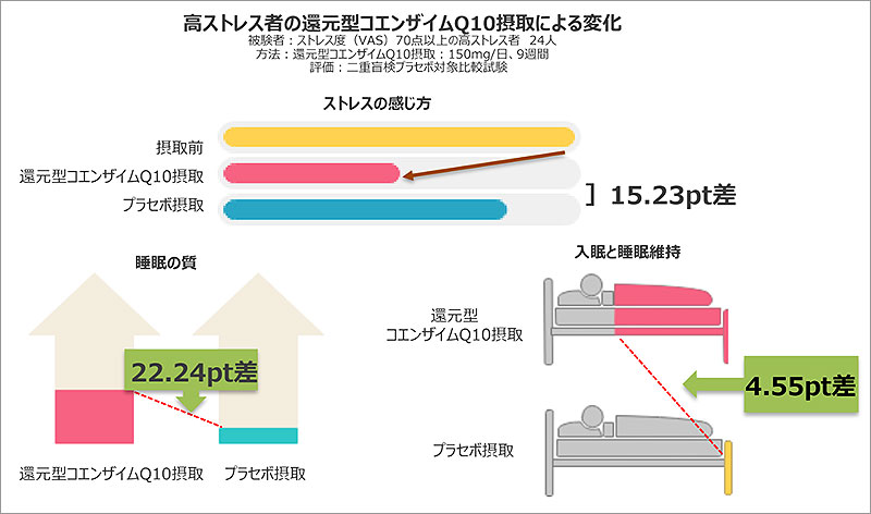 還元型コエンザイムQ10は、ストレスを強く感じている健常者の日常生活でのストレスの感じ方を軽減し、深く質の良い睡眠を維持して寝起きの疲労感を軽減するという試験データも報告されている。
