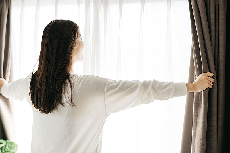 見落としがちなのが、寝ている間の朝方の光です。とくに夏場は日照時間が長く、朝早く明るくなるので知らない間に浅い睡眠が続きがち。しっかりと遮光カーテンやアイマスク等で明け方の光もコントロールすると良いでしょう。